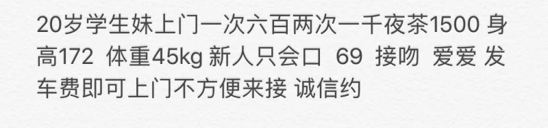 出差到那,晚上看电视呢,突然来电话问要服务吗,我说不要,过了一个小时有人敲门,我看门一看一个二十多岁女子,我问有事吗,她非要进来说,我说不行,不过最后还是没有坚持住,服务太到位了。爽!