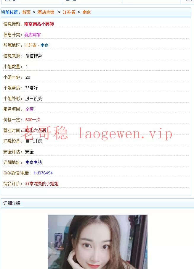 信息分类:黑店曝光 地区:江苏省-南京 信息来源:b 小姐数量:b 小姐年龄:b 小姐素质:b 小姐外形:b 服务项目:b 价格:b 营业时间:b 环境设备:b 安全评估:b 详细地址: (管理提示:经用户举报,此信息有诈骗行为,请勿被骗!) 联系方式: (管理提示:经用户举报,此信息有诈骗行为,请勿被骗!) 综合评价:b 详细介绍: 看着不像骗子 但是此号不存在 不知道作者是来骗金币的还是 什么 审核是怎么通过的???? 已删除! 骗子曝光