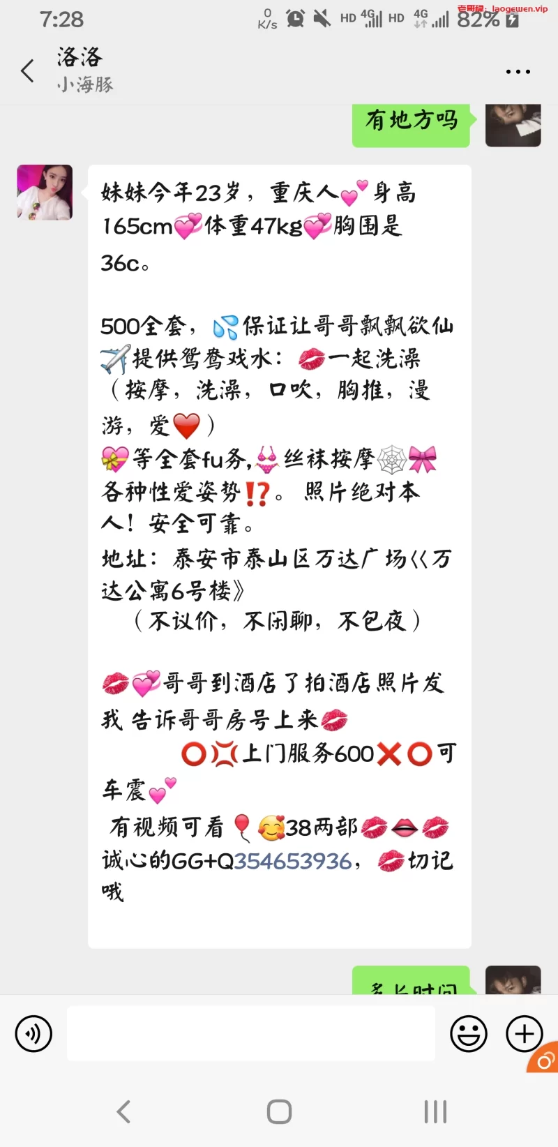 加了少妇好久终于有时间体验到了,人照基本一致,家里各种黑丝和JK服装,身材不错,美腿很直,苗条,水也很多,敏感小姐姐,服务的时候特别温柔有感觉,做的时候能感受到她高潮迭起,叫声销魂