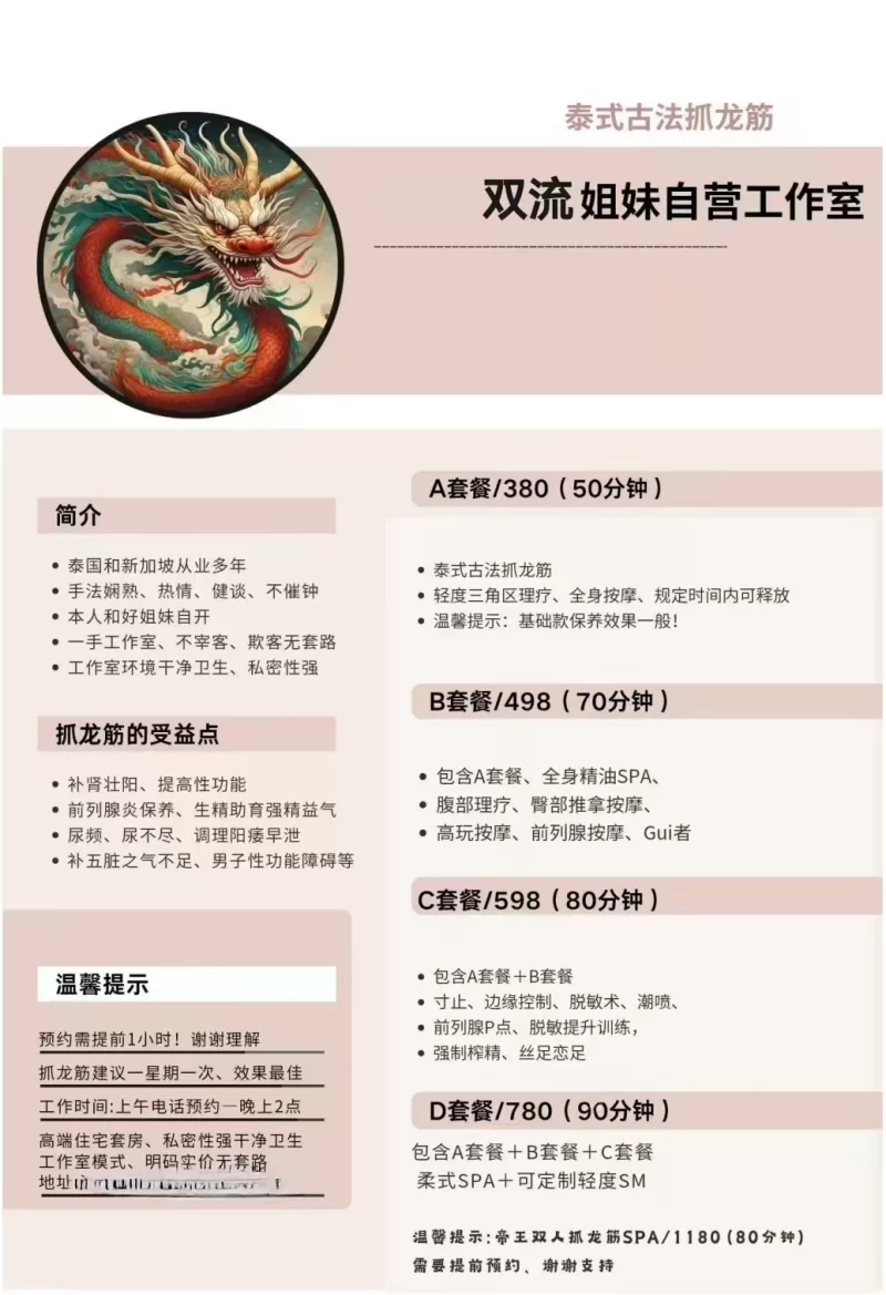 服务项目: 按摩、指划、精油spa、丝袜、波推、臀推、69、抓龙筋
